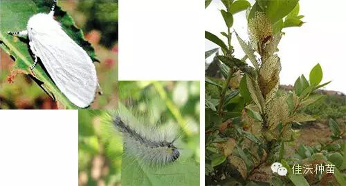 【3】美国白蛾:白蛾初孵幼虫成群聚集吐丝结白色网幕,1~4龄群集在网幕内取食,仅食叶肉,留下叶脉。随着龄期的增大,网幕增大,4龄以后分散为害,5龄以后食量增加,6~7龄不仅食叶肉,也食叶脉,大量发生时,短时间将整株树木的叶片食光,仅留下叶柄。对于美国白蛾的防治方法是摘卵块,剪除网幕,安装杀虫灯诱杀,性诱剂诱杀雄虫,利用Bt(苏云金芽孢杆菌)防治、美国白蛾核型多角体病毒。药剂方面拟除虫菊酯类农药,比方高效氯氰菊酯、甲氰菊酯。