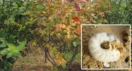 【2】蛴螬:蛴螬类食性颇杂,可以危害多种农作物、蔬菜、果树、林木、牧草的地下部分。蛴螬咬断幼苗的根、茎、断口整齐平截,常造成地上部幼苗枯死,被害状易识别。许多种类的成虫还喜食作物和果树、林木的叶片、嫩芽、花蕾等。蛴螬造成蓝莓植株叶片枯萎,树势减弱,甚至死亡。在成虫发生期可在园内设置糖醋液(红糖1份、醋4份、水10份),可以有效防治蛴螬危害,也可以利用毒死蜱乳油1000倍(触杀、胃毒)灌根或毒死蜱颗粒1-2kg/亩拌土防治蓝莓根围土中的蛴螬。