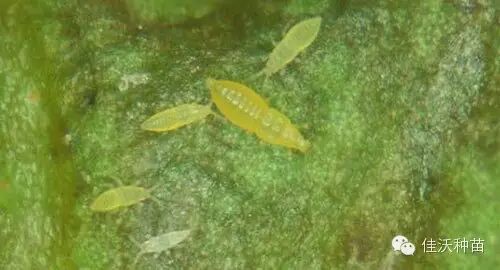 【5】蓟马:以成虫和若虫锉吸植株幼嫩组织(枝梢、叶片、花、果实等)汁液。被害后嫩叶及生长点变硬、卷曲枯萎,植株生长缓慢,节间缩短。蓟马喜干旱环境,因此保持土壤湿润,可以有效防治蓟马危害,同时蓟马具有趋蓝性,可以使用蓝色粘虫板诱杀成虫。蓟马虫害较为严重时候可以喷施呋虫胺、呋虫胺等药剂进行除害。